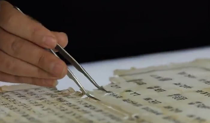 除了打補(bǔ)丁,另外一種修補(bǔ)方法是紙漿修補(bǔ)法——把紙打成紙漿,用滴管滴到破損的地方進(jìn)行修補(bǔ)。這種方式大多用于蟲蛀的破損修復(fù)。